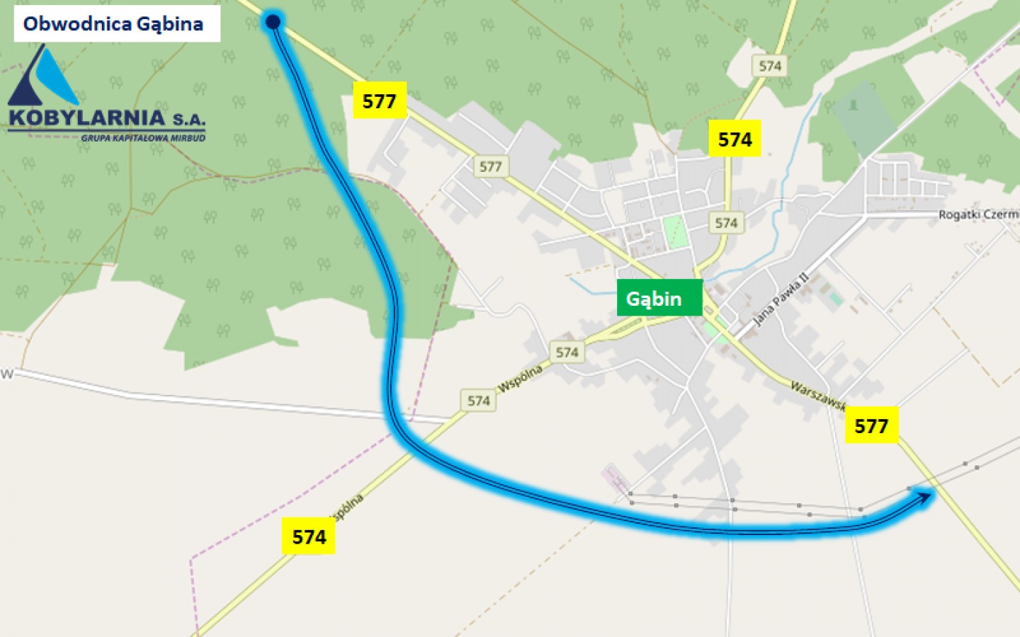 Zakres prac: Budowa nowego odcinka drogi wojewódzkiej nr 577 na południe od Gąbina. W zakres inwestycji wchodzi między innymi budowa nowej jezdni, dróg serwisowych, chodników, ścieżek rowerowych, przebudowa skrzyżowań, wykonanie 3 rond.